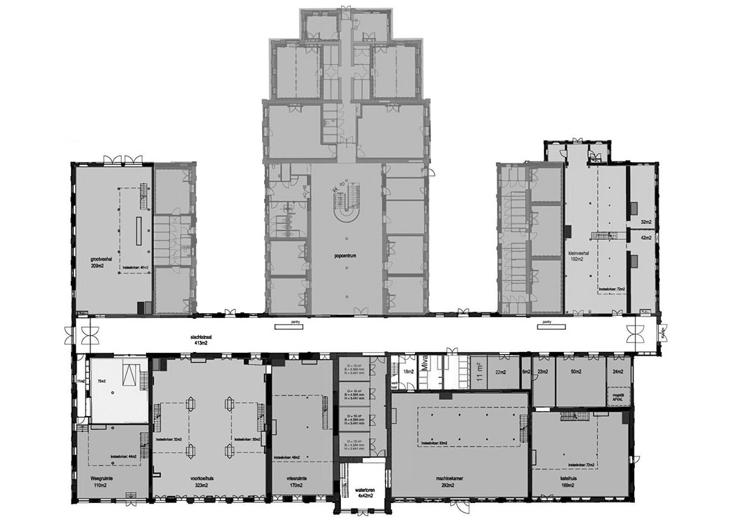 In totaal realiseren we ongeveer 5.000 m2 commerciële ruimten verdeeld over het slachthuis en de stallen, variërend in grootte van 25 tot ruim 500 m2. Naast het al geopende popcentrum is er ruimte voor 2 horecagelegenheden met terras, kantoorruimtes voor creatieve en dienstverlenende ondernemers en sport. Vrijwel alle ruimtes in het voormalige slachthuis komen uit op de gemeenschappelijke slachtstraat. Deze straat, bestraat in dezelfde stijl als het openbaar gebied, is overdag openbaar toegankelijk en wordt voorzien van statafels, een pantry en (kleine) terrassen voor de horeca. Hier kunnen alle ondernemers bij elkaar komen. Daarnaast leent de slachtstraat zich bij uitstek voor het organiseren van kleinschalige evenementen door de ondernemers tezamen. Deze plek moet het bruisende hart van het voormalige Slachthuis worden.